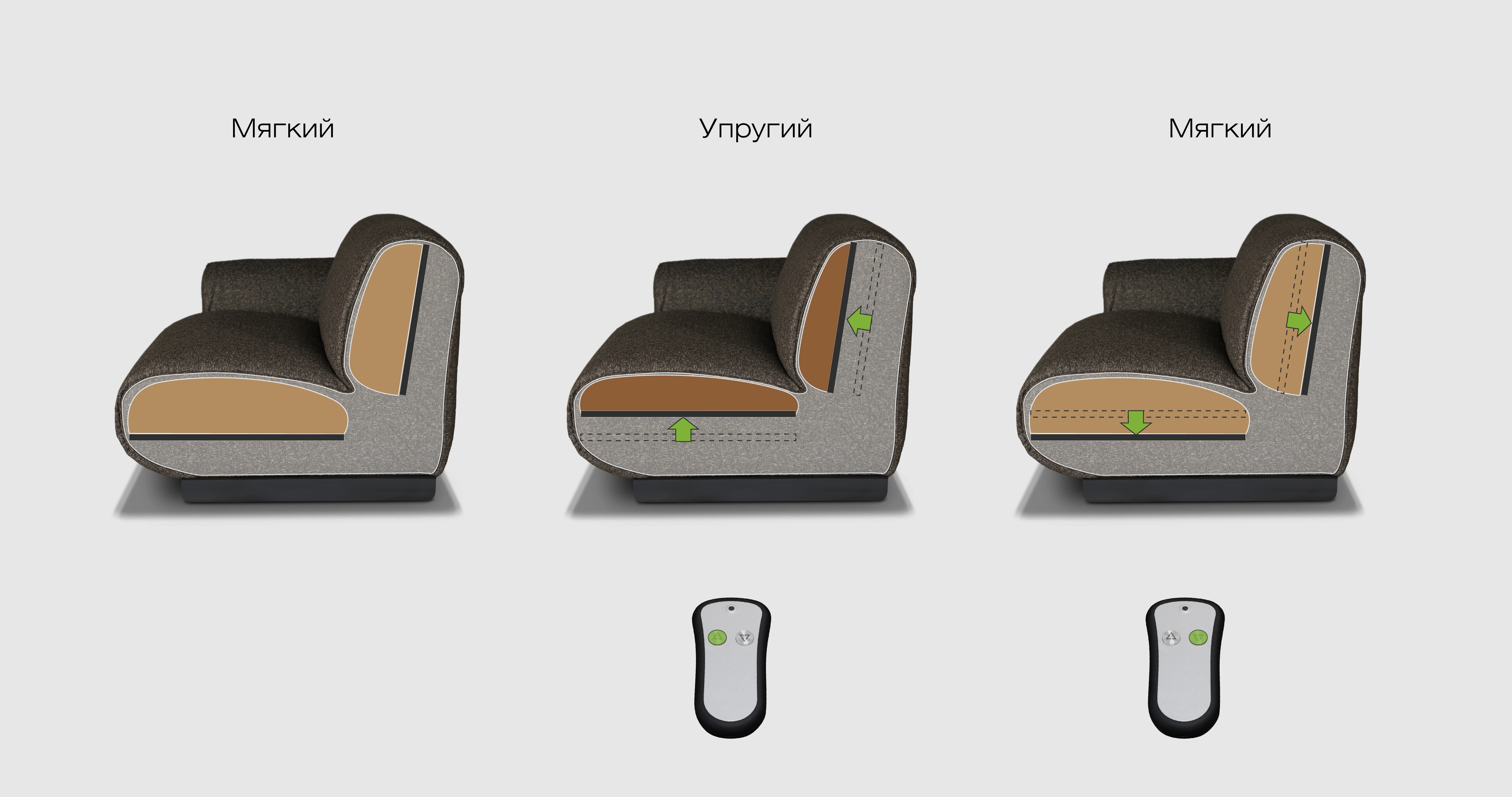 Франко AI - это первый умный диван, в котором есть возможность менять мягкость для каждого посадочного места дивана индивидуально одним нажатием кнопки.